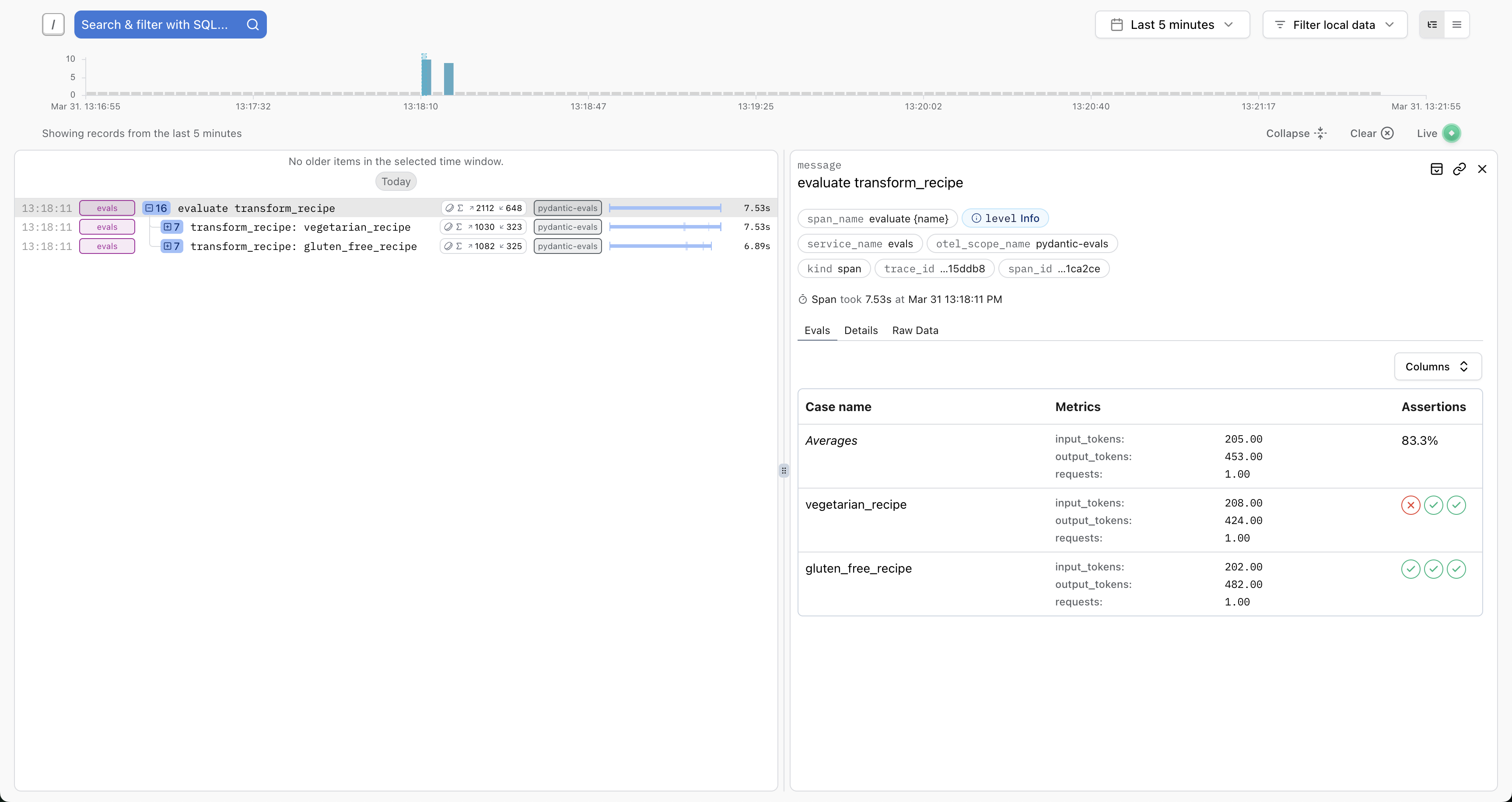 Logfire has some special integration with Pydantic Evals traces, including a table view of the evaluation results